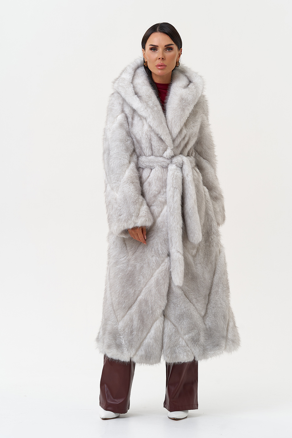 Фасон - прямой Длина изделия - 125 см Цвет - светло-серый (лед) Материал - экомех Состав полотна - полиэстер 100% Подкладка - полиэстер 100% Вид застежки -крючки, пояс Вид ворота - капюшон Фасон рукава - встачной, длинный |