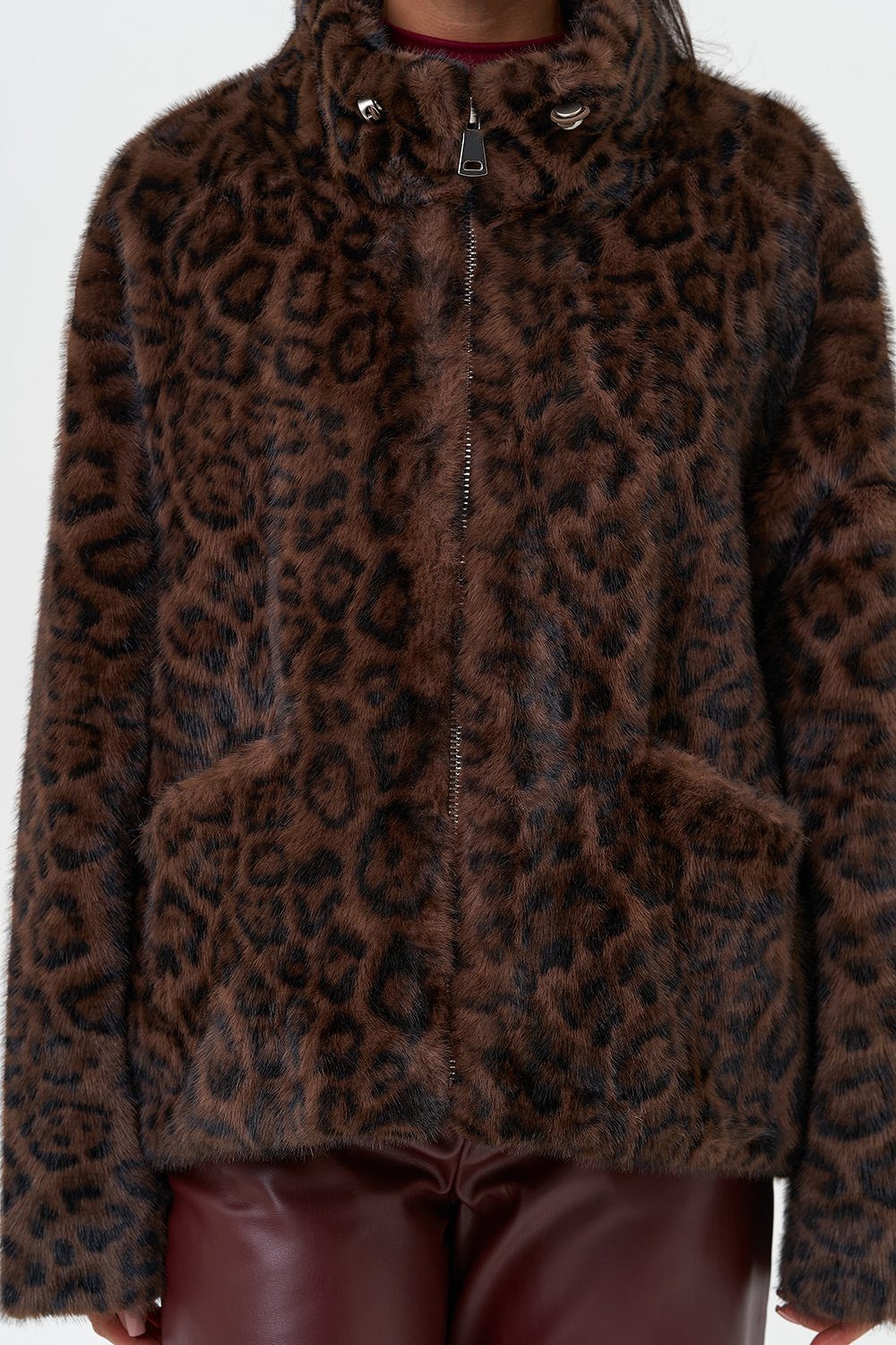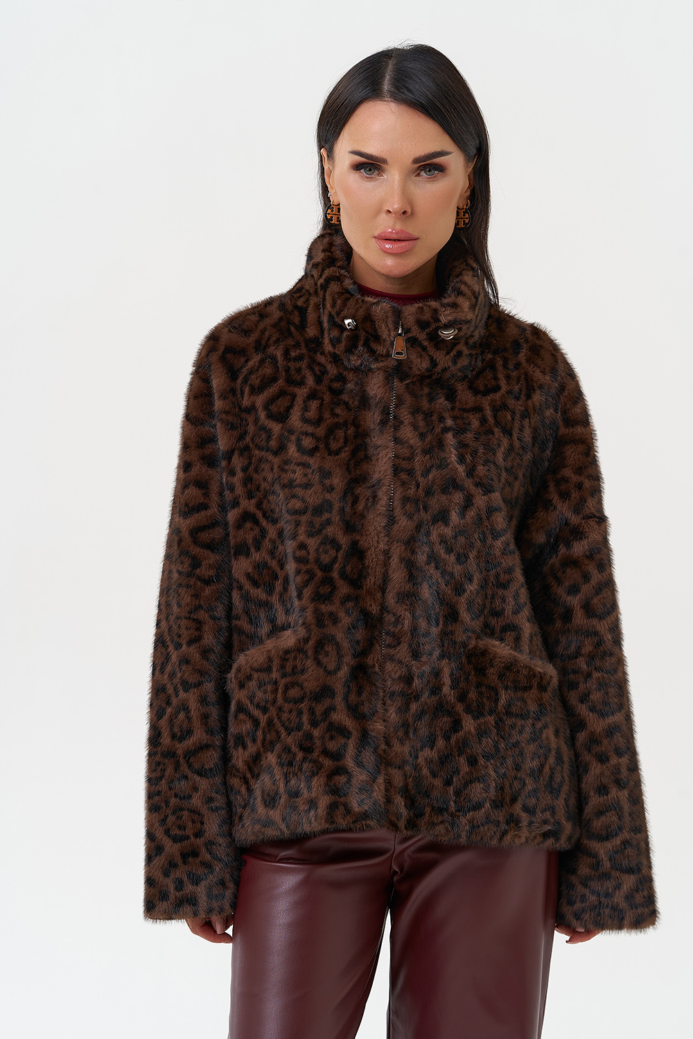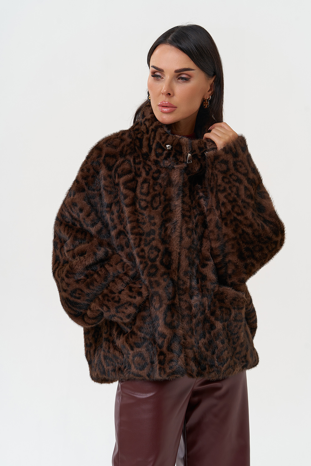 Фасон - прямой Длина изделия - 65 см Цвет - коричневый Принт - леопард Материал - экомех Состав полотна - полиэстер 100% Подкладка - полиэстер 100% Вид застежки - молния Вид ворота - стойка Фасон рукава - реглан, длинный |